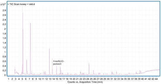 Total ion current chromatogram of a mixed honey sample (consisting of a mixture of a wildflower, a chestnut and an acacia honey sample) in the presence of the internal standard 4-methyl-2-pentanol at a concentration of 25 µg/L.