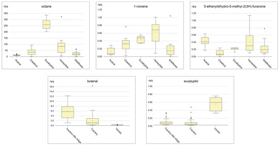 The content of these molecules in the samples of the different botanical and geographic origins are reported in the box plot in Figure 3. First, it is important to underline that different VOCs were mainly responsible for the botanical and geographic differentiations of the honey samples, confirming that these two factors differently affect the volatile composition of honey. As for the botanical origin, octane strongly characterized the eucalyptus honey sample for the high content and the acacia honey for the very low content, in agreement with the literature [34]; 1-nonene characterized the honeydew honey for the greatest content, and acacia and wildflower honey for the lowest content, while 5-ethenyldihydro-5-methyl-2(3H)-furanone characterized acacia honey for the greatest content and chestnut honey for the lowest content. As for the geographic origin, eucalyptol clearly differentiated the samples from Veneto, while butanal clearly differentiated the samples from Trentino-Alto Adige for the greatest content.