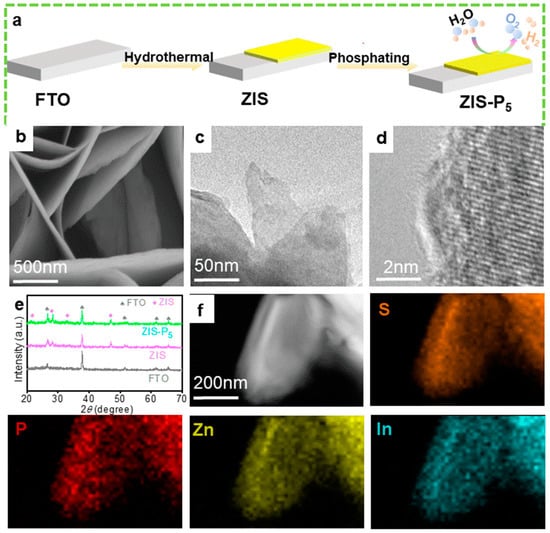 (a) Schematic illustration of the preparation procedure for ZIS-P5; (b) SEM image of ZIS-P5; (c,d) TEM images of ZIS-P5; (e) XRD patterns of different photoanodes; (f) energy dispersive spectroscopy (EDS) elemental mapping.