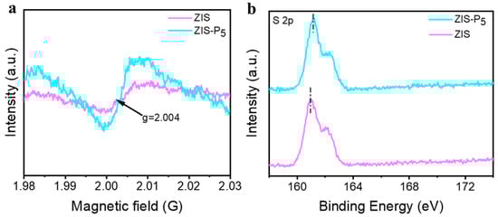 (a) EPR spectra of ZIS and ZIS-P5; (b) S 2p of ZIS and ZIS-P5.