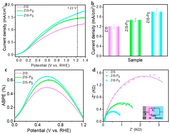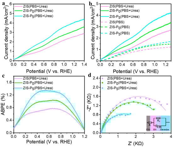 To further explore the advantages, the performance of ZIS-based photoanodes for urea oxidation under AM 1.5 G was studied. In comparison to the pristine ZIS and ZIS-P0, ZIS-P5 shows more negative onset potential and excellent PEC urea oxidation performance. As presented in Figure 6a, the ZIS-P5 exhibits the best PEC urea oxidation performance, achieving a photocurrent density of 4.13 mA cm−2 at 1.23 V vs. RHE. In the absence or presence of urea (Figure 6b), ZIS-based photoanodes have a higher photocurrent density for urea oxidation (4.13, 3.24, and 2.61 mA cm−2 for ZIS-P5, ZIS-P0, and ZIS, respectively) than that of PEC water oxidation (1.66, 1.46, and 1.18 mA cm−2 for ZIS-P5, ZIS-P0, and ZIS, respectively) at 1.23 V vs. RHE. In addition, the ABPE curves were calculated by LSV, where the value of ABPE decreases in the following order: ZIS-P5 > ZIS-P0 > ZIS (Figure 6c), which is consistent with the LSV results. To further elucidate that P doping and Sv still show positive effects in charge separation and surface catalysis, we performed an EIS test for different samples (Figure 6d). Through the analysis of Nyquist plots (Table S4), we find that ZIS-P5 photoanode has a much smaller resistance (Rct, 664 Ω) to that of ZIS-P0 (1610 Ω) and ZIS (3480 Ω). All the results presented above prove that the charge separation and surface reaction kinetics can be simultaneously boosted by P doping and Sv.