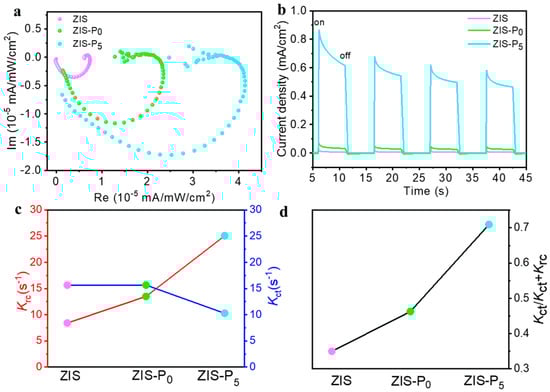 (a) IMPS responses for ZIS and ZIS-Px; (b) I-t curves; (c) charge transfer rate (Kct) and recombination rate constant (Krc); (d) charge transfer efficiency results.