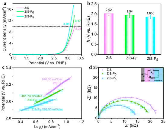 Except for efficient charge separation through the synergistic effect, whether the surface catalytic activity can be affected is ambiguous. Therefore, we measured the OER performance of different samples using a standard three-electrode system. In Figure 5a, the potentials of ZIS, ZIS-P0, and ZIS-P5 are 3.25 V, 3.17 V, and 3.08 V at a current density of 10 mA cm−2, respectively. It can be seen that ZIS-P5 has the lowest overpotential (Figure 5b) in all samples, indicating that ZIS-P5 has better OER performance compared to its counterparts. In order to further confirm this result, the Tafel slopes were further investigated. (Figure 5c). In Figure 5c, ZIS-P5 shows a much lower Tafel slope of 298.33 mV dec−1 than that of ZIS-P0 (461.73 mV dec−1) and ZIS (646.66 mV dec−1). The above results further confirm that the superior OER activity of ZIS-P5 can mainly be ascribed to the sufficient active sites and excellent electrical conductivity through introducing the P element and Sv, which can be supported by the results of EIS (Figure 5d and Table S3) and cyclic voltammograms (CV, Figure S13).
