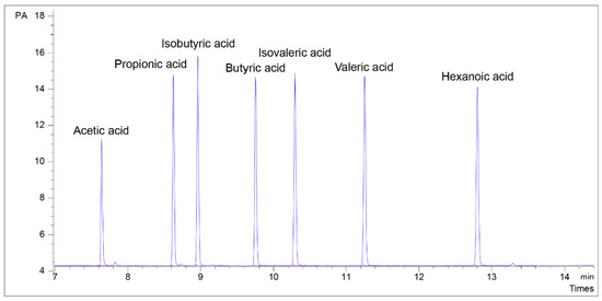 Chromatogram of mixed standards at L3 concentration (representing the average physiological concentration of SCFAs in the fecal and intestinal samples). Acetic acid, 107.41 µM; Propionic acid, 80.32 µM; Isobutyric acid, 63.11 µM; Butyric acid 64.92 µM; Isovaleric acid, 53.56 µM; Valeric acid, 54.34 µM; Hexanoic acid, 45.89 µM.