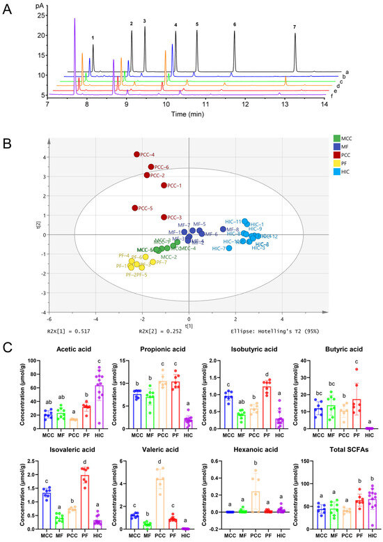 (A) Gas chromatograms of standards and samples. (a) SCFA standards of L3 concentration; (b) SCFA extract from mouse cecum contents; (c) SCFA extract from mouse feces; (d) SCFA extract from pig cecum contents; (e) SCFA extract from pig feces; (f) SCFA extract from honeybees’ (Apis mellifera) intestinal contents. Numbers 1−7 represent acetic, propionic, isobutyric, butyric, isovaleric, valeric and hexanoic acid, respectively. (B) The PCA plots of the SCFA data in fecal and intestinal content samples from different sources. MCC, mouse cecum contents; MF, mouse feces; PCC, pig cecum contents; PF, pig feces; HIC, honeybee intestinal contents. (C) To compare the levels of acetic, propionic, isobutyric, butyric, isovaleric, valeric, and hexanoic acids in different samples. Statistical data are expressed as mean ± standard deviation. The results corresponding to bars with different letters were statistically significant (p < 0.05). On the contrary, the results corresponding to bars with the same letter were not statistically significant.
