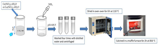 The precipitation method was used to synthesized single cerium and lanthanum oxide nanopowders (CeO2, La2O3) (Figure 1) [24]. Ce(NO3)3∙6H2O or La(NO3)3∙6H2O were dissolved in Milli Q water up to the point where they reached a concentration of 0.2 M for each salt. Then, to the obtained solutions were added dropwise ammonium solution up to pHs 8–8.5. The stirring was continued for 15 min after the completion of precipitation. The obtained colloidal solutions were washed with Milli Q water followed by four cycles of centrifugation at a speed of 3000 rpm (for 15 min). The resultant products were then dried in an oven at 110 °C for 8 h and crushed to powders. The oven-dried precursors were calcined at 850 °C for 2 h in air atmosphere to obtain CeO2 and La2O3 nanopowders.