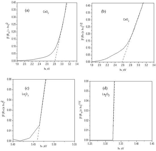 The evaluation of band gap energy (Figure 3) showed that the Egi and Egd values of the La2O3 sample are 5.32 eV and 5.46 eV (Table 1), respectively. On the other hand, CeO2 sample exhibits lower Egi and Egd values, equal to 2.59 and 2.81 eV, respectively, indicating that both the catalysts are able to absorb only UV light [35].