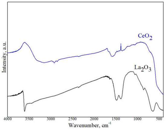The FTIR spectra in the range of 400–4000 cm−1 for CeO2 and La2O3 photocatalysts are shown in Figure 5.