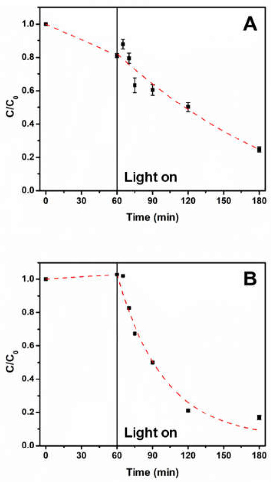 Preliminary experiments were carried out under dark conditions to evaluate the possible extent of the adsorption process. Under these conditions, 19% of LEV removal was observed in the presence of CeO2 (Figure 6A), whereas no removal was observed in the presence of La2O3 (Figure 6B).