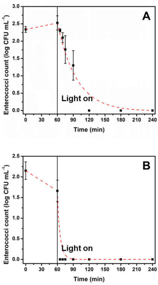 LEV resistance phenotypes were tested using the Kirby–Bauer method according to standard recommendations [27]. The test allowed for the selection of the Enterococcus faecalis ATCC 29212 strain as resistant to levofloxacin. Briefly, the colonies, before the treatment, were transferred to appropriate culture broth for growing. Bacterial strains were grown to the exponential phase in Tryptic Soy Broth at 37 °C overnight. After 24 h, via spectrophotometric method at 590 nm, the density was adjusted to obtain a suspension of 0.5 McFarland (standard turbidity), corresponding approximately to 1–2 × 108 CFU/mL suspension. The inactivation experiment was conducted by spiking an aliquot of bacterial suspension with an initial density of 108 CFU/mL to the reaction solution, already added with the catalyst, in order to dilute it up to a concentration of 106 CFU/mL. The stirred mixture was then sampled after 60 min in the dark and then at time intervals of 0, 5, 10, 15, 30, 60, and 180 min. Subsequently, through the technique for inclusion of the inoculum in a solidifiable substrate (“Pour Plate”), the sample to be analyzed was inoculated into an empty sterile 90 mm Petri dish, then, adding the agarized substrate (12–15 mL), was kept in fusion at 45–46 °C. For this procedure, a selective medium for the isolation and enumeration of fecal streptococci (Slanetz and Bartley agar) was used. The inactivation of total (initial concentration 1.0 × 106 CFU/mL) Enterococci was evaluated after 24 h of incubation on this substrate. Bacterial count was performed in triplicate.
