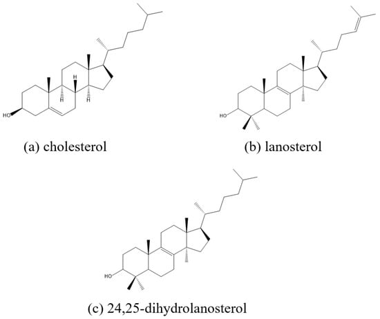 Structural formulas of cholesterol, lanosterol, and 24,25-dihydrolanosterol.