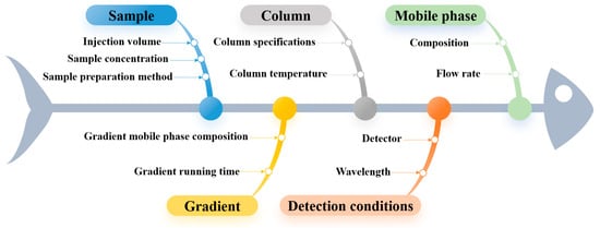 Through a literature review and brainstorming, a fishbone diagram was constructed to outline potential CMPs, as depicted in Figure 2. The method parameters were categorized into five groups: mobile phase, detection conditions, column, gradient, and sample. Based on the preliminary experimental findings, the gradient, column temperature, and flow rate were selected as potential critical method parameters for the experimental design and investigation.