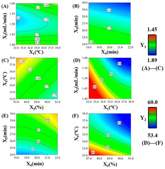 Contour plots of chromatographic responses and analysis conditions. (A) X3 = 90.5% X4 = 19 min, X5 = 25 min; (B) X1 = 37 °C, X2 = 1.5 mL/min, X3 = 90.5%; (C) X2 = 1.58 mL/min, X4 = 19 min, X5 = 25 min; (D) X3 = 90.5% X4 = 19 min, X5 = 25 min; (E) X1 = 37 °C, X2 = 1.5 mL/min, X3 = 90.5%; (F) X2 = 1.58 mL/min, X4 = 19 min, X5 = 25 min.