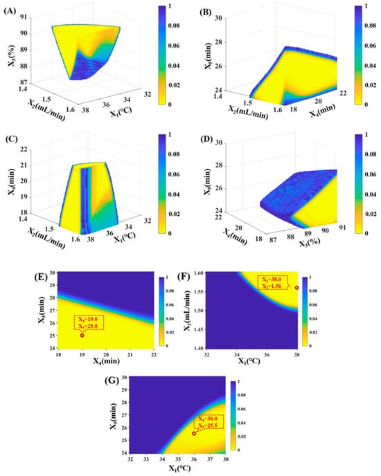 The results of the MODR. (A) X4 = 19 min, X5 = 25 min; (B) X1 = 37 °C, X3 = 90.5%; (C) X3 = 90% X5 = 25 min; (D) X1 = 37 °C, X2 = 1.5 mL/min; (E) X1 = 37 °C, X2 = 1.58 mL/min, X3 = 90.5%; (F) X3 = 91% X4 = 19.5 min, X5 = 25.5 min; (G) X2 = 1.6 mL/min, X3 = 90% X4 = 19.5 min.