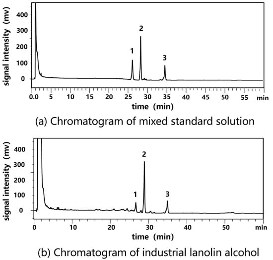 Preparation of Test Solution: Approximately 20 mg of industrial lanolin alcohol was accurately weighed into a 10-mL volumetric flask. N-Methyl-2-pyrrolidone was added and dissolved using an ultrasonic processor (KQ2200E, Meimei Ultrasonic Instruments Co., Ltd. Kunshan, China). The solution was then diluted to the mark and centrifuged at 12,000 rpm for 10 min using a mini high-speed centrifuge (AB204-N, Mettler Toledo, Zurich, Switzerland), and the supernatant was then obtained for analysis.
