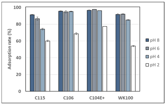 Adsorption rate of sinapine onto Purolite C115, C116, C104E+, and Diaion WK100 at pHs 2, 4, 6, and 8 (after 120 min).
