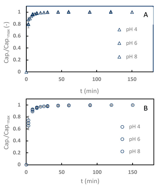 Relative adsorption capacity kinetics of sinapine adsorption onto Purolite C106 (A) and C104E+ (B) at pHs 4, 6, and 8. Relative adsorption capacity is expressed as capacity at t over maximum capacity (at 25 °C).
