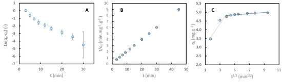 Kinetic adsorption of sinapine onto C106 resin at pH 4 (25 °C) regressed with linearized pseudo-first-order (PFO) model (A), linearized pseudo-second-order (PSO) model (B), and linearized intraparticle diffusion model (C).