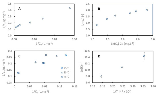 Adsorption isotherms of sinapine data on C106 at pH 4 and 25 °C, regressed with linearized Langmuir and Freundlich models (A,B). Impact of the temperature on sinapine adsorption isotherm (C) and Ln K vs. 1/T plot (D).