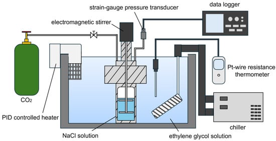 The schematic diagram of the experimental apparatus is shown in Figure 2 and Figure 3. Because the phase equilibrium conditions are specified by the pressure and temperature, state functions, in the isochoric method, there is no difference in the phase equilibrium conditions obtained using different apparatuses, and data consistency is guaranteed. The pressure-resistant vessels (1) and (2) are made of stainless steel. The inner dimension diameter of vessel (1) is 80 mm, the depth is 40 mm, and the inner volume is 200 cm3. The inner dimension diameter of vessel (2) is 20 mm, the depth is 92 mm, and the inner volume is 65 cm3. These vessels were immersed in ethylene glycol solution baths. The temperatures of the baths were controlled by PID controlled heater (model TR-2α, As One Co., Ltd., model BF400, Yamato Scientific Co., Ltd., Tokyo, Japan) and an immersion cooler (ECS-30, Tokyo Rikakikai Co., Ltd., Tokyo, Japan, model BE201, Yamato Scientific Co., Ltd., Tokyo, Japan). The temperatures inside the cells were varied by changing the temperature of the ethylene glycol solution. The temperature of the ethylene glycol solution was measured by two platinum resistance thermometers (Reference Calibration Thermometer, Electronic Temperature Instruments Ltd., Worthing, U.K., expanded uncertainty was ±0.1 K). These thermometers were used to measure the temperature of ethylene glycol at two different points in the ethylene glycol bath. After confirming the difference between their values to be less than the expanded uncertainty, the average of the two was recorded. The pressure in the cell was measured by a strain-gauge pressure transducer (model PG-50KU and model PG-100KU, Kyowa Electronic Instruments Co., Ltd., Tokyo, Japan) and tracked by the data logger (model GL840, Graphtec Co., Ltd.). The formation and decomposition of hydrate were accelerated by stirring the vessel with an electromagnetic stirrer (Nitto Koatsu Co., Tokyo, Japan).