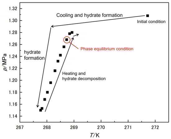 The isochoric method was employed as described in the introduction for three-phase equilibrium conditions measurements. This method is most frequently used for measuring phase equilibrium conditions, using hydrate formation and decomposition [35,36,37,38]. Figure 4 shows the p-T history obtained with the isochoric method in this study. The detailed procedure is as follows. Supply water (rubidium chloride aqueous solution in this study) to the vessel. After depressurizing the cell to less than 0.01 MPa, the guest compound (CO2 in this study) is supplied to a given pressure. The temperature is set where hydrate will not form. It is noted that the temperature and pressure at a steady state are recorded as the initial conditions. The vessel was then cooled to form hydrate. Hydrate formation may be observed by a sudden drop in pressure, as shown in Figure 4. After confirming the pressure drop, the temperature is increased to decompose the hydrate. If hydrate decomposes, the pressure in the vessel increases significantly because the gas encapsulated in the hydrate is released. After the pressure rise stops, the temperature is raised again. Repeat this operation until all hydrate is decomposed. In this study, the data were measured at the step of 0.1 K. When there is no hydrate in the cell, the pressure increases slightly with increasing temperature. Since the increase in pressure varies depending on the presence or absence of hydrate, the slope of the p-T diagram changes at a certain point. Because all hydrates may be decomposed at this point, the condition just before this point where hydrate certainly exists is defined as the three-phase equilibrium condition. In Figure 4, the initial condition was 271.7 K and 1.31 MPa. The vessel was cooled from this condition, and hydrate formation occurred. The system became a steady state at 267.8 K and 1.15 MPa. The temperature was increased at the step of 0.1 K, and steady-state conditions were recorded. The slope of these plots changed after 268.8 K. 268.7 K and 1.27 MPa; the condition just before this point is a three-phase equilibrium condition obtained from this measurement.