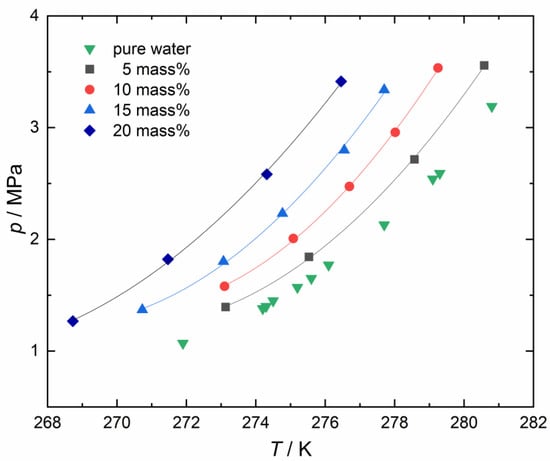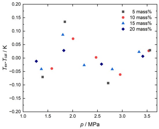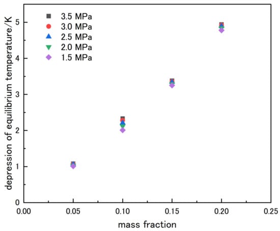 The fitting parameters a and b are dimensionless. This equation represents the temperature and pressure at phase equilibrium conditions linearly on the lnp − 1/T diagram. Figure 6 shows the lnp − 1/T diagram of phase equilibrium conditions data measured in this study. As shown in the lnp − 1/T diagram, the plots were aligned approximately in a straight line at a given concentration. Table 3 shows the values of a, b, and the coefficient of determination R2 of the straight lines approximated with Equation (13) from the data experimentally measured at mass fractions of 0.05, 0.10, 0.15, and 0.20. Figure 7 shows the deviation between the phase equilibrium temperature obtained in this study and calculated from the Clausius–Clapeyron equation using the fitting parameter in Table 3 for a given concentration. The vertical and horizontal axes represent the difference in equilibrium temperatures and pressure. The average absolute deviations of the measured values from the calculated one at mass fractions with 0.05, 0.10, 0.15, and 0.20 were 0.0819 K, 0.0403 K, 0.0437 K and 0.0174 K, less than the expanded uncertainty of measurements. From the above discussion, the experimentally obtained data are consistent with the Clausius–Clapeyron equation. The data shown in Figure 7 also confirm the consistency of the data obtained with two different apparatuses. For comparing the phase equilibrium temperatures of each concentration at given pressures, the plots on the p-T diagram were interpolated and extrapolated by exponential functions. Table 4 shows the phase equilibrium temperatures obtained by this interpolation and extrapolation for pure water and the rubidium chloride aqueous solutions systems at 1.5, 2.0, 2.5, 3.0, and 3.5 MPa. It should be noted that the consistency with the Clausius–Clapeyron equation in pure water and CO2 systems is clearly described in the previous study [25]. Figure 8 shows the degree of decrease in the phase equilibrium temperatures of an aqueous solution system from a pure water system at a given pressure. The horizontal and vertical axes represent the mass fraction of solutions and the degree of depression in phase equilibrium temperature. As shown in Figure 8, the degree of decrease in the phase equilibrium temperature is roughly proportional to the mass fraction of the solutions. On the other hand, this degree does not change with increasing pressure.