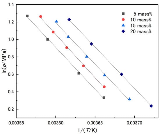 The measured L + V + H three-phase equilibrium conditions of CO2 hydrate in rubidium chloride aqueous solution are shown in Table 2. The reliability and repeatability of measurements using the same apparatus were demonstrated in the previous studies [25,39,40]. Figure 5 shows the p-T diagram of phase equilibrium data obtained in the present and previous studies [25]. The expanded uncertainty of temperature was ±0.1 K, and the uncertainty of pressure was ±0.03 MPa. The inverted triangle represents the phase equilibrium conditions of CO2 hydrate in the pure water + CO2 system. The squares, circles, triangles, and diamonds represent the phase equilibrium conditions in the rubidium chloride aqueous solution + CO2 systems with mass fractions of 0.05, because the phase equilibriums are 0.10, 0.15, and 0.20 obtained in this study. The curves drawn for the four aqueous solutions are approximations using the Clausius–Clapeyron Equation (13) described below. As shown in Figure 5, the phase equilibrium conditions shifted toward the lower temperature and higher pressure with the increased concentration of rubidium chloride aqueous solution. Hydrate formation was inhibited by electrolytes, as reported in the previous studies. As described in the introduction, the activity coefficient, which determines the chemical potential of water, depends on the presence of electrolytes. Because the chemical potential of water in the liquid phase decreases with increasing the mole fraction of RbCl, the phase equilibrium conditions where the chemical potentials of the three phases are equal moved to lower temperature and higher pressures at more elevated concentrations. To assess the internal consistency of the data newly obtained in the present study, the Clausius–Clapeyron Equation (13) was employed.