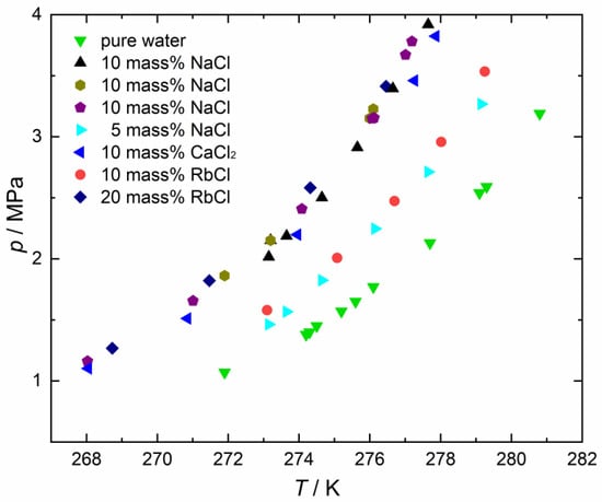 Three-phase equilibrium conditions of CO2 hydrate in RbCl, NaCl and CaCl2 aqueous solution measured in the present and previous studies [25,26,27,28] are shown in Figure 9. RbCl solution with mass fractions of 0.10 and 0.20 are the results of this study, while the data of NaCl with mass fractions of 0.05 and 0.10 and CaCl2 with mass fraction of 0.10 are from the previous studies. The mole fractions at given mass fractions are in Table 5. Their mole fractions were calculated using the molar masses of RbCl, NaCl and CaCl2 as 120.9 kg/kmol, 58.4 kg/kmol and 111.0 kg/kmol. As shown in Table 5, the mole fractions of rubidium chloride and sodium chloride aqueous solutions with mass fractions of 0.10, 0.20, and 0.05, 0.10 are approximately the same. Since both RbCl and NaCl are assumed to be entirely ionized, the mole fractions of electrolytes are also almost the same. The degree of decrease in the phase equilibrium temperatures of NaCl and RbCl at 3.0 MPa with mass fractions of 0.05 and 0.10 was 1.96 K and 2.29 K. With the mass fractions of 0.10 and 0.20, the degrees of decrease were 4.77 K and 4.93 K at 3.0 MPa. Comparing RbCl and CaCl2 solutions with mass fraction of 0.10, the mole fraction of the CaCl2 solution is approximately 1.09 times that of the RbCl solution. However, the degree of depression in the phase equilibrium temperature of the CaCl2 solution at 3MPa was 4.24 K, which is 1.85 times that of the RbCl solution. The activity coefficient of water, which determines the chemical potential of water in the liquid phase, is influenced only by the presence of electrolytes. The magnitude of the effect is ion-specific and depends on the molar concentration of electrolytes and ion–water interactions. Comparing the RbCl and NaCl solutions with similar mole fractions, the depression of phase equilibrium temperature is almost the same because the differences in chemical potentials of the water in the liquid phase are similar. The slightly larger decrease in phase equilibrium temperature of the rubidium chloride aqueous solution is ascribed to the larger mole fraction of the aqueous solution and ion–water interactions. Because RbCl and CaCl2 ionize to two and three ions, the degree of depression in the CaCl2 solution system is significantly larger even in similar mole fractions. Table 5 and Figure 9 indicate the correlation of the concentrations and equilibrium temperature differences. As mentioned in the introduction, there is an approach to using a statistical thermodynamic model to predict the phase equilibrium conditions of hydrates in salt systems. These results would contribute to improving the accuracy of that prediction.