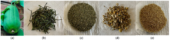 Pictures of (a) elite Taiwanese smooth luffa plant, (b) dried luffa peels, (c) ground luffa peels, (d) dried chamomile flowers, and (e) ground chamomile flowers.