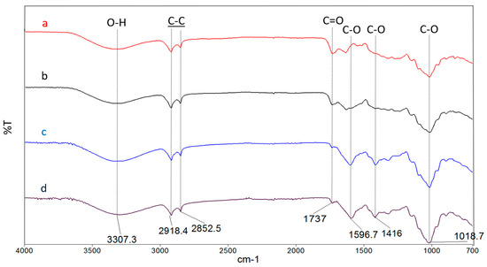 Figure 2 illustrates the FTIR spectra of acid-treated and base-treated chamomile flower before and after metal ion adsorption. The sorbent exhibits characteristic peaks corresponding to O-H (phenols and alcohols or water), and possible N-H stretching at the broad peak around 3307 cm−1, C-H stretching at 2918 and 2852 cm−1, C=O stretching at 1737 cm−1. A strong C-O stretching from phenol around 1019 cm−1 [13,23,26,33]. The base treatment (spectra c) resulted in a reduction in the intensity at 1737 cm−1 (C=O). While two additional peaks were observed at 1599−1 and 1416 cm−1, corresponding to C-O stretching possibly from carboxylate [34]. This may imply that C=O may exist in the form of COOH in acidic condition, and base treatment causes it to deprotonate [34].