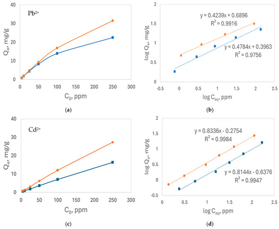 The adsorption of Cd2+ was conducted using luffa peels under the same conditions as Pb2+ adsorption for comparison. Figure 3c illustrates the isotherm plots, Qe vs. C0, and the Freundlich linear plots for Cd2+ (Figure 3d are very similar to those for Pb2+. Lower Qe values were observed for all concentrations of Cd2+ compared to Pb2+ on both sorbents. In addition, Kf calculated from the intercept and the slope 1/n values for Cd2+ were higher than 0.5, all confirming that Cd2+ had a lower affinity for the binding sites on the luffa peels than Pb2+. The R2 values from both linear plots suggest that the Freundlich model also effectively describes the Cd2+ adsorption process.