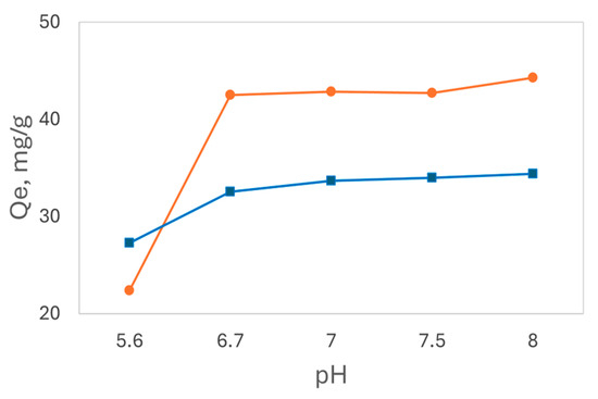 Due to the higher solubility of Cd2+ at pH values below 10, its adsorption is not confined to acidic conditions. A pH study was conducted on a 250 ppm Cd2+ solution to investigate the maximum adsorption capacity of the biosorbents. An AA buffer at pH 5.6 and Tris buffers at pH levels of 6.7, 7.0, 7.5, and 8.0 were used to identify the optimal pH conditions. As illustrated in Figure 4, the Qe values of both base-treated chamomile and luffa peels increased significantly from pH 5.6 to 6.7 and slowly increased up to pH 8.0 with no precipitation observed. Consequently, pH 8.0 was selected for further analysis of Cd2+ adsorption.
