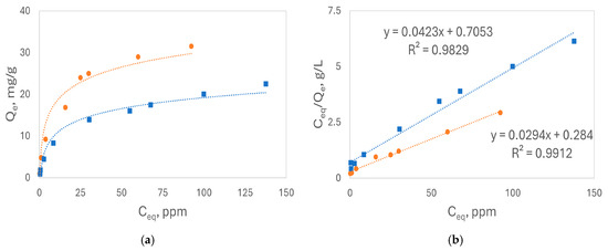 The Langmuir isotherm model is also used as an empirical model for equilibrium adsorption studies. It enables the determination of the maximum monolayer adsorption capacity () for an adsorbent. The nonlinear and linear forms of the Langmuir isotherm are represented by Equations (5) and (6) below [29].