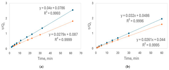 The kinetics study of Pb2+ adsorption was conducted using a 250 ppm Pb2+ initial solution over a time range of 1–60 min at pH 5.6, under the same conditions as the equilibrium studies. The adsorption process occurred rapidly, with approximately 32% of Pb2+ in the solution adsorbed onto both base-treated and acid-treated luffa peels within 1 min of contact. The adsorptions reached equilibrium within approximately 60 min. At this time, the base-treated luffa peels exhibited a Pb2+ adsorption efficiency of 68%, while the acid-treated luffa peels showed an efficiency of 48%. Both values closely align with those obtained from the equilibrium studies, indicating that adsorption equilibrium was achieved within 60 min. Figure 6a shows the linear plot based on the pseudo-second order model for Pb2+ adsorption onto luffa peel biosorbent. The slope from the linear plot of the base-treated luffa peels is smaller, resulting in a higher Qe due to the inverse relationship between Qe and the slope of the linear plot shown in Equation (7). Additionally, the strong linearity of both plots indicates that the pseudo-second order model effectively describes the bio-adsorption kinetics of the processes [8].