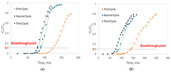 Breakthrough curves for (a) Cd2+ (b) Pb2+ adsorption at different adsorption–regeneration cycles.