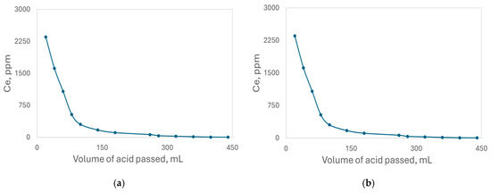 The adsorbed cadmium and lead ions were then recovered by feeding 0.4 M HNO3 at a draining speed of 4 mL/min until no heavy metal ions were present in the drained solution, monitored by ICP-AES. The biosorbents were then washed with UP deionized water until the draining solution reached a neutral pH. The adsorption–desorption processes were repeated three times to evaluate the reuse ability of the luffa peels. The recovery efficiency (R%) was obtained using Equation (12), shown below [27].