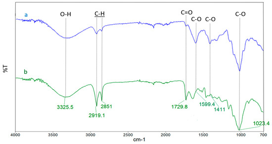 FTIR spectra in the 4000–700 cm−1 region were collected with a Perkin Elmer Spectrum 100 FTIR spectrometer (LR 64912C)(Springfield, IL, USA). with a diamond-attenuated total reflectance (ATR) accessory. The resolution was set to 4 scans at 1 cm−1 with ambient air as background.