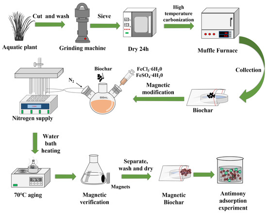 Adsorption is distinguished among various methods for the removal of antimony (Sb) from water due to its high efficiency, low cost, and ease of operation. At present, the primary materials utilized for adsorbing Sb encompass polymeric iron, polymeric aluminum, and so on. Despite their effectiveness, these materials tend to generate dispersed flocculants within the aqueous environment, complicating recovery efforts and failing to achieve complete separation of pollutants. This situation can lead to adverse effects on the contaminated water body. Therefore, it is essential to develop a method that can thoroughly eliminate Sb pollutants from water through effective adsorption and recovery processes while providing technical support for addressing Sb pollution effectively. Biochar, an eco-friendly and economical adsorbent, is favored for its large surface area, high porosity, and substantial adsorption capacity [8]. Additionally, the presence of functional groups such as carboxyl, amino, and hydroxyl on biochar’s surface enhances selective cation adsorption [9]. However, due to the small particle size of the biochar powder, which is relatively dispersed and difficult to be separated from the water body after the application, several studies have indicated that biochar may pose potential risks to aquatic environments. These risks include exacerbation of eutrophication, acceleration of pollutant migration, and inhibition of growth in aquatic organisms [10]. In order to improve recycling of biochar materials, magnetic modification of biochar has become a research hotpot [11]. Modification via Fe-doping technology serves as a straightforward and effective method to enhance biochar adsorbents by introducing additional adsorption sites, thereby improving their overall adsorption capacity [12]. Currently, the raw materials employed for the preparation of biochar mainly consist of wood, straw, coconut shell, and food waste. The organic waste resources mostly originate from terrestrial vegetation, and there are relatively few studies on the utilization of aquatic plants as raw materials for the preparation of magnetic biochar.