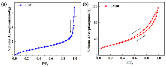 Adsorption and desorption isothermal curves of LBC (a) and LMBC (b).