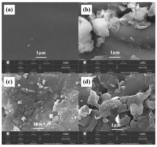 SEM Figure 3 illustrates the microtopography of LBC and LMBC before and after adsorption. As observed in Figure 3a,c, the surface of LBC was smooth and flat prior to adsorption, whereas the surface of LMBC exhibited collapse and cracks. This indicates that the magnetization modification generated a greater number of reaction sites on LMBC, which facilitated the adsorption process. Following the adsorption of Sb, as depicted in Figure 3b,d, numerous particulate matters appeared on the surfaces of both LBC and LMBC. These particulates are likely to be adsorbed substances, including Sb compounds.