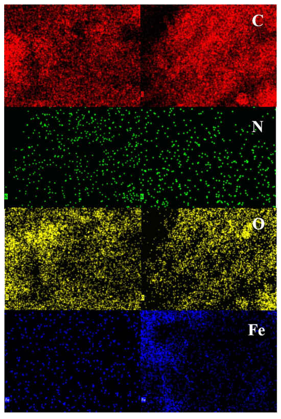 EDS The fluorescence diagrams and atomic number percentages are presented in Figure 4 and Table 2. It can be concluded that the primary element in LBC and LMBC is carbon (C), as its atomic number percentage exceeds 50%, followed by oxygen (O), nitrogen (N), and iron (Fe). Notably, the content of Fe in LMBC increased significantly to 7.88% compared to just 0.07% in LBC. Additionally, the fluorescence diagram indicates a marked increase in blue fluorescent dots corresponding to Fe, suggesting that iron was successfully incorporated onto the surface of LMBC during the magnetic modification process.