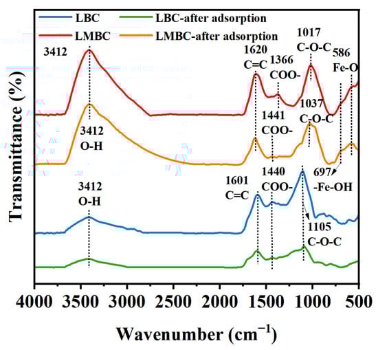 FTIR The results of functional group changes of LBC and LMBC before and after adsorption are presented in Figure 5. The infrared spectra before and after Sb adsorption are basically the same, indicating that the basic structure of the material has not changed. The peaks observed between 3000 and 3500 cm−1 correspond to the stretching vibrations of unsaturated C-H and O-H bonds [26]. Additionally, the peaks within the range of 1450–1650 cm−1 are attributed to the stretching vibrations of C=C bonds found in the aromatic hydrocarbon benzene ring skeleton [27]. Peaks located at 1010–1120 cm−1 correspond to C-O-C, which is a characteristic peak associated with glycosidic bonds present in polysaccharides; notably, this peak shifted post-adsorption and exhibited reduced intensity [28]. The peaks at 1366 cm−1 and 1440 cm−1 were symmetric and antisymmetric vibrational bands attributed to the ionic carboxyl groups. It is evident that, after adsorption, these bands shifted collectively to 1441 cm−1, suggesting that -COOH groups participated in the Sb adsorption process. This shift likely resulted from coordination interactions between Sb ions and oxygen-containing functional groups [29]. The FTIR spectra indicated that the main structure of LBC was aromatic hydrocarbon, which had many hydroxyl groups and other sites favorable for the adsorption of Sb. The formation of magnetite on the surface of LMBC was further confirmed by the observation of a strong characteristic peak of Fe-O vibration of magnetite at 580 cm−1 and the Fe-OH bond at 679 cm−1 [30].