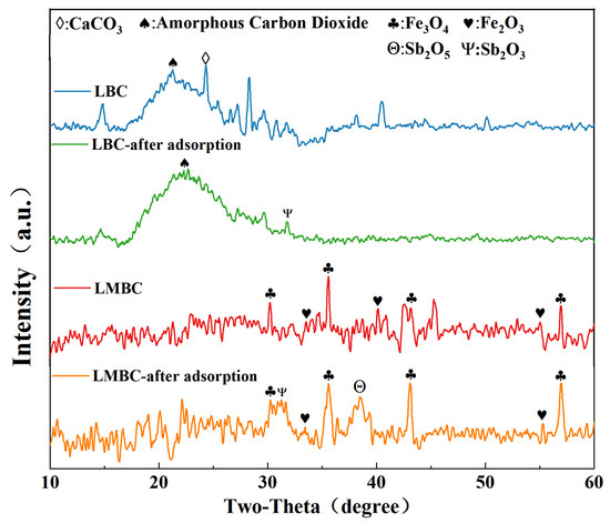 XRD The XRD patterns of LBC and LMBC before and after adsorption are presented in Figure 6. It is evident that there were relatively obvious diffraction peaks in the LBC near 2θ = 21.31° before and after adsorption, which might be the presence of amorphous carbon. In the range of 2θ from 26.02° to 27.89°, there were obvious characteristic diffraction peaks in the spectrum of LBC, which might be caused by the pyrolytic carbonization of biomass at high temperatures, resulting in the precipitation of carbonates and the highlighting of CaCO3 diffraction peaks [31]. The characteristic peaks appearing at 2θ of 30.17°, 35.59°, 43.15°, and 56.93° for LMBC and LMBC-Sb corresponded to the (220), (311), (400), and (511) crystal faces in the Fe3O4 cubic crystal, which is in accordance with JCPDS:26-1136 standard cards. The characteristic peaks at 2θ of 33.12°, 40.83°, and 54.04° corresponded to the (104), (113), and (116) crystal faces in Fe2O3 cubic crystals, which is in accordance with JCPDS: 72-0469 standard cards [32]. The characteristic peaks observed at 2θ angles of 31.22° and 38.54° were indicative of the formation of Sb2O3 and Sb2O5, respectively, within the LMBC framework during the adsorption process. The results suggested that the oxidized iron oxides present in LMBC interacted with Sb through a combination of adsorption and co-precipitation.