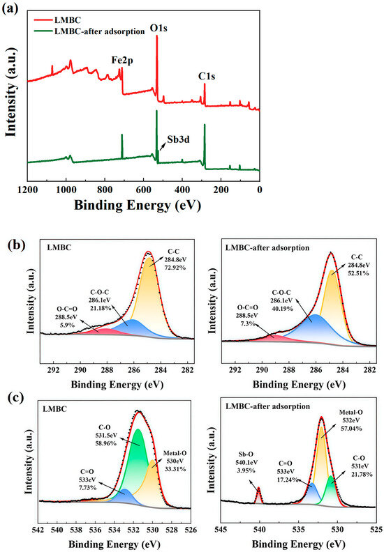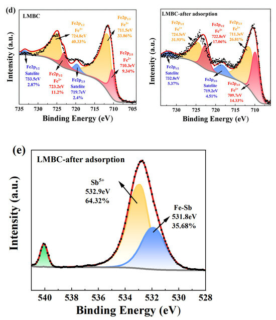 XPS The XPS spectra of LMBC before and after the adsorption revealed that C, O, and Fe were the main elements (Figure 7a), confirming the successful loading of Fe on the LMBC. Notably, new peaks corresponding to Sb appeared in the spectrum following adsorption, indicating that Sb was effectively adsorbed by LMBC. The observed decrease in the percentage of C-C bonds (Figure 7b) demonstrated that C-C bonds were broken as a result of the redox reaction [33]. Additionally, an increase in the percentage of Metal-O peaks (Figure 7c) confirmed that metal oxides formed post-adsorption as a result of Sb addition [34]. The Fe 2p region (Figure 7d) was deconvoluted into five peaks, with the peaks at 724.8 eV, 711.5 eV, and 710.3 eV assignable to Fe3+ and Fe2+ species, respectively [35]. Before adsorption, the masses of Fe3+ and Fe2+ were 74.19% and 20.54%, respectively. After adsorption, the percentage of Fe3+ decreased to 58.74%, while that of Fe2+ increased to 31.39%. This change suggests that some portion of Fe3+ acted as an oxidant during this process, providing substantial support for the proposed mechanism underlying Sb oxidation removal. Furthermore, these spectral peaks exhibited shifts towards lower binding energies upon complexation with Sb species; this observation implies that an inner-sphere complex was generated between iron-oxygen moieties and Sb species. The masses of Sb5+, Fe-Sb, and Sb3+ species in the Sb peaks after adsorption were 67.32%, 28.76%, and 3.92%, respectively (Figure 7e), which proved that Sb had been adsorbed by LMBC and indicated that part of Sb3+ in LMBC was oxidized to Sb5+ [36].