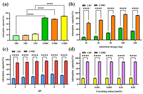 (a) Effect of biochar and magnetic biochar prepared by different aquatic plant species; (b) effect of biochar and magnetic biochar dosage; (c) effect of initial pH; and (d) effect of ionic strength. “****”: the number of asterisks denotes the level of statistical significance, with four asterisks indicating a p-value of less than 0.0001, signifying a highly significant difference between LBC and LMBC.