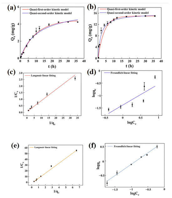 (a) Adsorption kinetics of LBC; (b) adsorption kinetics of LMBC; (c,d) adsorption isotherm of LBC; and (e,f) adsorption isotherm of LMBC (experimental conditions: 150 mL of 5 mg/L Sb solution with 100 mg LMBC at the initial pH of 8).