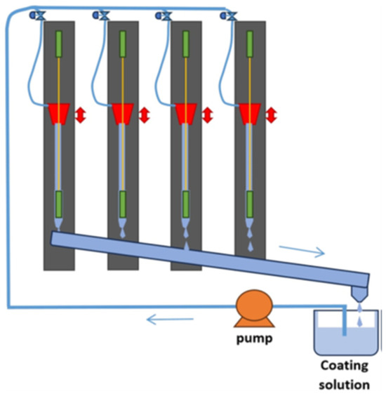 Based on our previous work [24], and as depicted in Figure 1, we designed and constructed an upscaled HF coating device. This was used to simultaneously coat four 70 cm-long porous HFs made of porous polyimide/GNPs (prepared by dry jet-wet spinning with green GBL solvent-based P84/GNP dope, according to an earlier work [25]). The fibers were coated three times at a flow rate of 30 mL/min with 1% crosslinked PDMS (Sylgard 184) in n-hexane. Cross-linked PDMS is a well-known material for gutter layers in thin-film composite membranes. The primary function of the gutter layer is to facilitate the formation of uniform selective layers on its surface, while inhibiting pore intrusion. PDMS is particularly suitable for this application due to its high CO2 permeability, which minimizes gas transport resistance. Subsequently, they were coated twice with a 5% Pebax-1657 solution using an eco-friendly ethanol/water solvent (70/30 wt.%). As a result, approximately 2 m of defect-free coated HFs (effective length of 0.5 m for each HF after coating) were prepared in about 2.5 h, including a 30-min interval between each coating cycle. The total amount of both coating solutions used was less than 100 mL, rendering this upscaled “drop-casting under flow” technique highly energy- and cost-efficient compared to other dip-coating methods.
