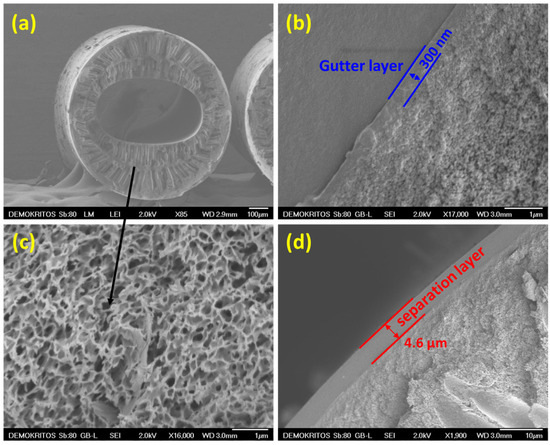 SEM micrographs of the composite HF membrane: (a) cross-sectional view showing overall morphology; higher magnification images illustrating (b) the gutter layer; (c) the wall region with a sponge-like structure region; and (d) the separation layer thickness.