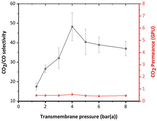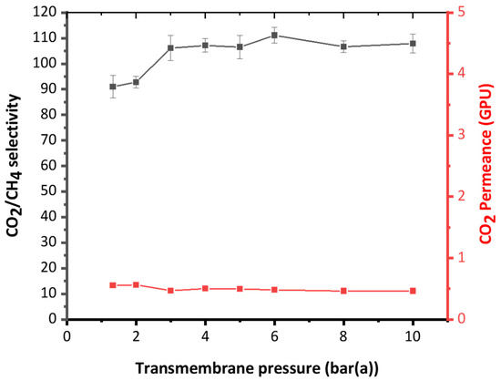 Regarding CO2 permeance, the data show a relatively steady value of around 0.5 GPU throughout the entire pressure range. This consistency in CO2 permeance suggests that the membrane’s capacity to permit CO2 passage remains highly unaffected by variations in transmembrane pressure. The stable permeance combined with high selectivity makes it suitable for applications requiring high CO2 selectivity without compromising permeance, even with changes in operating pressure [28,29,30,31,32].