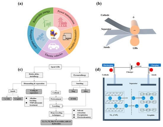 (a) Applications of lithium-ion batteries; (b) The shape and components of some Li-ion battery configurations; (c) Flow-chart showing the typical recycling process; (d) Schematic diagram of the LIB working principle.